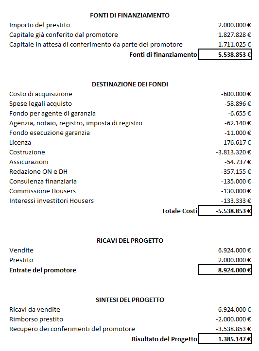 Conforme al REGOLAMENTO (UE) 2020/1503 DEL PARLAMENTO EUROPEO E DEL CONSIGLIO del 7 ottobre 2020 relativo ai fornitori europei di servizi di crowdfunding per le imprese, si informa che il presente progetto potrebbe coinvolgere persone collegate, conformemente al Codice di Condotta Interno di Housers, che potrebbero acquisire la qualifica di investitori e quindi di finanziatori. L'importo e la partecipazione finale di queste persone saranno comunicati a tutti gli investitori del progetto una volta completato il finanziamento dello stesso.